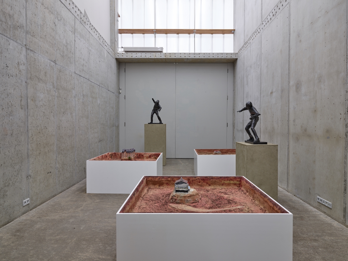 Something is yanking these men around, tearing at a pant leg, pulling at sleeves. Three bodies are under attack—but whoever or whatever is attacking them is invisible. Cast in bronze, the three figures, smaller than life size, stand on pedestals in KOW’s upper space.